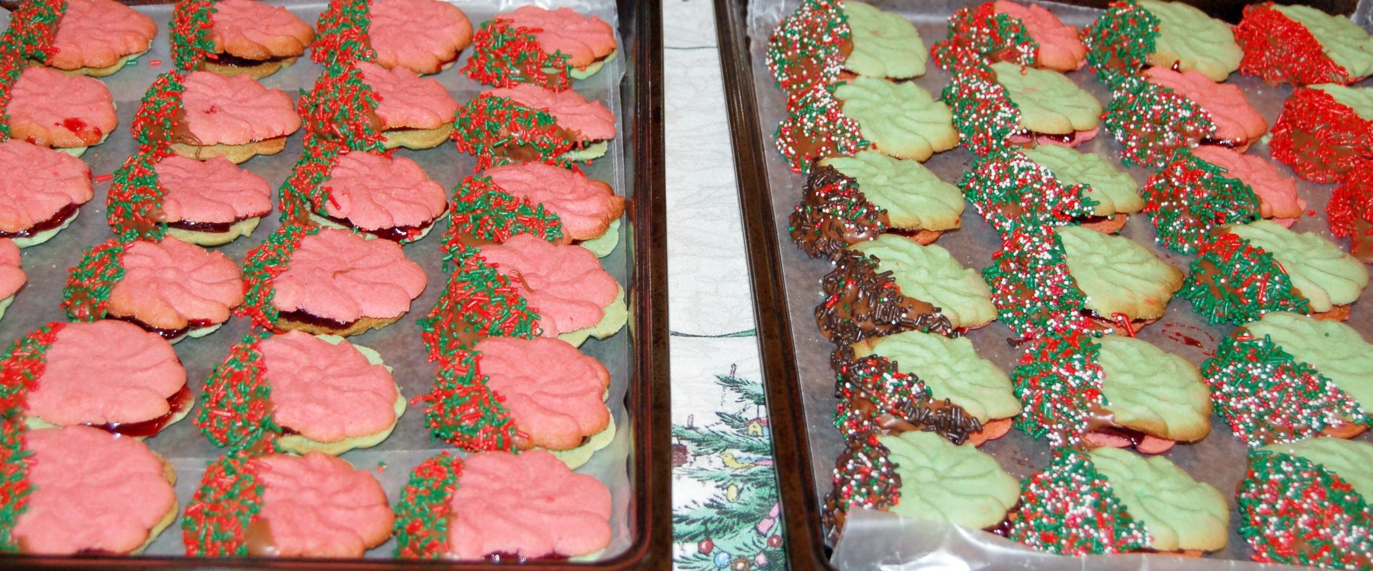 Butter, Eggs, Granulated Sugar, Vanilla Extract, Flour, Salt, Baking Powder, Raspberry Preserves, Semi-Sweet Chocolate for dipping and Holiday Sprinkles