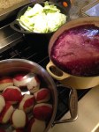 I used half of a purple cabbage sliced up and placed in the bottom of the pot.