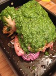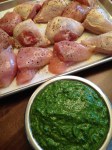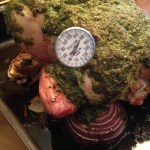 If you are using the chicken pieces, top them with the pesto and place them in the oven for 30-40 minutes rotating the pan at the halfway mark. Use your meat thermometer to check that the meat reaches 165 degrees. The bone-in pieces may take a few minutes longer than the boneless.