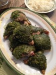 If you are using the whole roasting chicken, remove the pan from the oven and top the chicken with the pesto. Place the pan back in the oven and continue to roast, uncovered, for the remaining time. These D’artagnan chickens seem to roast in about 50-60 minutes total. Check the internal temperature of the meat at the 50 minute mark. Remove the chicken from the oven when it reaches 162 degrees, and set it on the counter covered with foil, for ten minutes. This will allow the temperature to rise to 165 degrees and will keep the meat juicy! Carve and Enjoy!