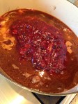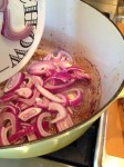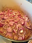 Add the sliced red onion to the pot and sauté for about a minute. Add the meat back into the pot on top of the onions. Pour the combined ketchup/jam mixture on top of the meat. Add the entire container of beef broth to the pot and bring to a quick boil. Cover the pot and place in the oven for three hours.