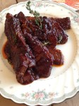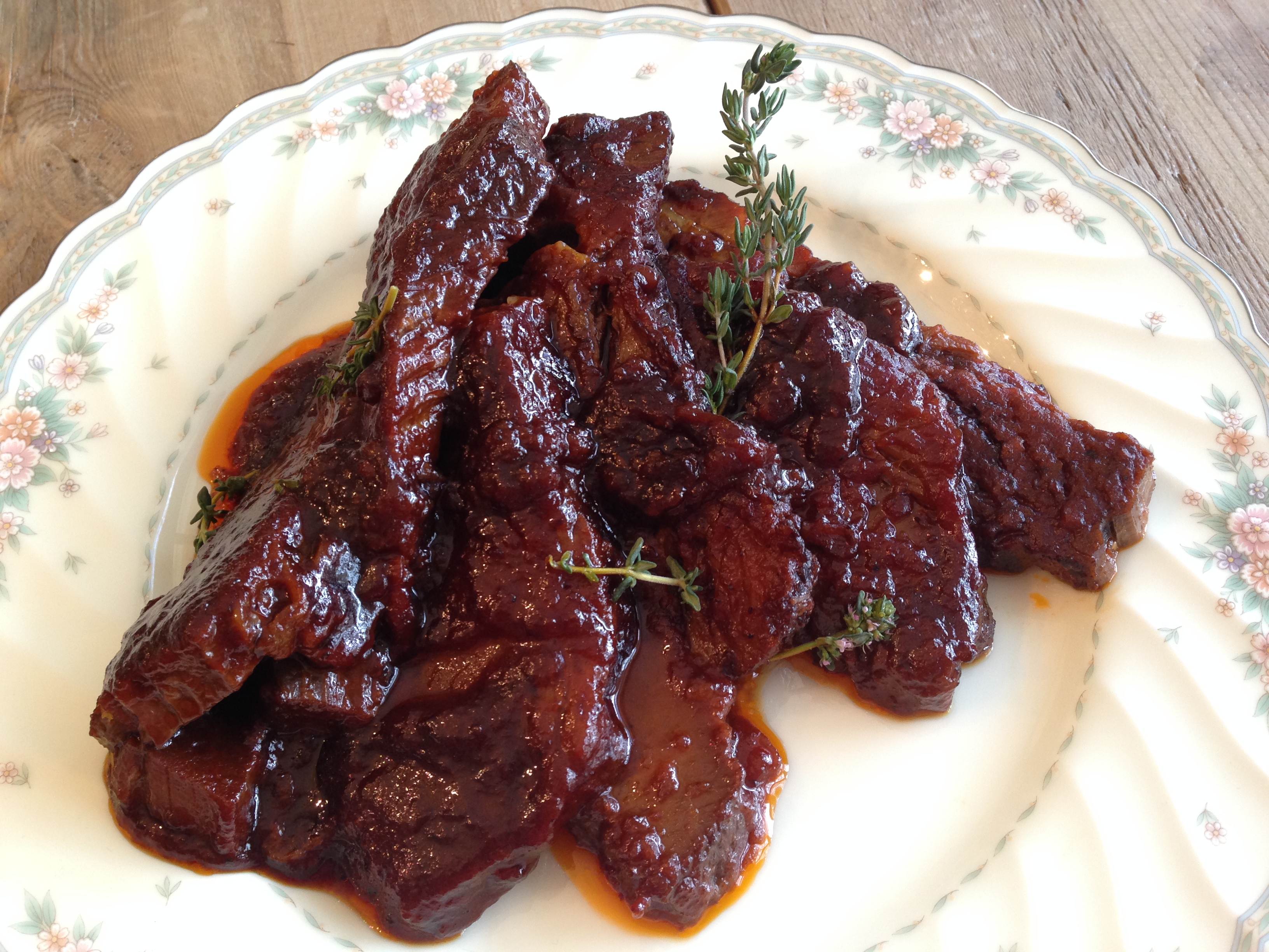 At the end of the braising time, you can remove the meat to a cutting board and slice with an electric knife. Use an immersion blender to bring the sauce together. Place the slices of meat in a roasting pan, cover with the sauce and return to the oven for thirty minutes. Garnish each plate with fresh thyme.