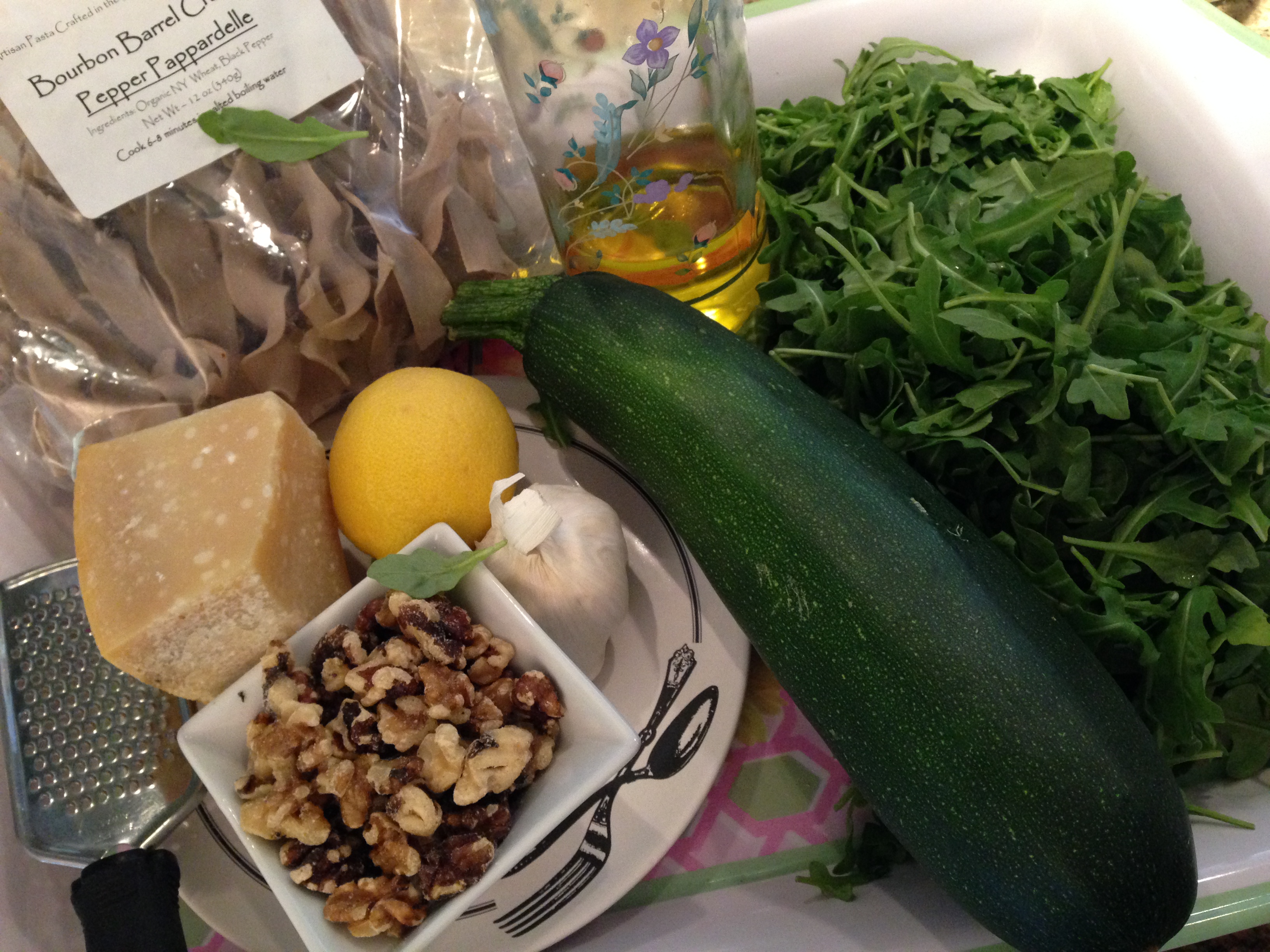 Northern Farmhouse Bourbon Barrel Cracked Pepper Pappardelle with Arugula Pesto and Zucchini